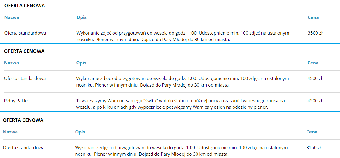 Przykładowe ceny fotografów ślubnych na portalu fotograf-wesele.pl