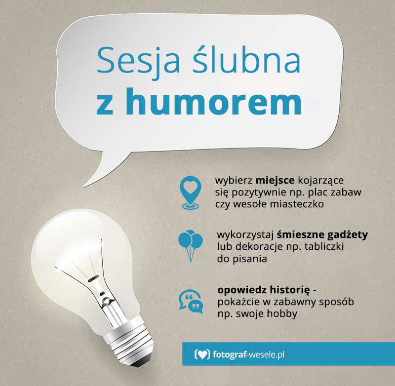 Sesję ślubną z humorem można właściwie urządzić w każdym plenerze. Co więcej, im mniej jest on „widowiskowy”, tym lepiej, bo nie będzie odwracał uwagi od młodej pary. Dlatego możemy zrezygnować z wyjazdu do Paryża lub na Kasprowy Wierch, te miejsca lepiej zostawić dla par, które wagę sesji ślubnej oceniają przez piękne tło. W dowcipnej sesji najważniejsze są żarty i dobry humor, a to można uzyskać na łące, w lesie, czy przy stoliku w kawiarni. Jeśli zależy nam na konkretnym plenerze, dobrze wybrać miejsce, które kojarzy się z dzieciństwem. Świetnie sprawdzi się tutaj plac zabaw albo wesołe miasteczko, które dają możliwość uzyskania bardzo różnorodnych zdjęć, przedstawiając parę jako „wieczne dzieci”, które potrafią cieszyć się życiem i świetnie bawią się w swoim towarzystwie. Można też wykonać sesję ślubną... we własnym domu. Para może pozować w ślubnych strojach do najbardziej zwyczajnych scen z małżeńskiego życia, stereotypowo przedstawiając wymagającą żonę, czy leniwego męża. Opcji jest bardzo wiele i wystarczy ruszyć głową, żeby znaleźć pomysł na opowiedzenie ciekawej historii.